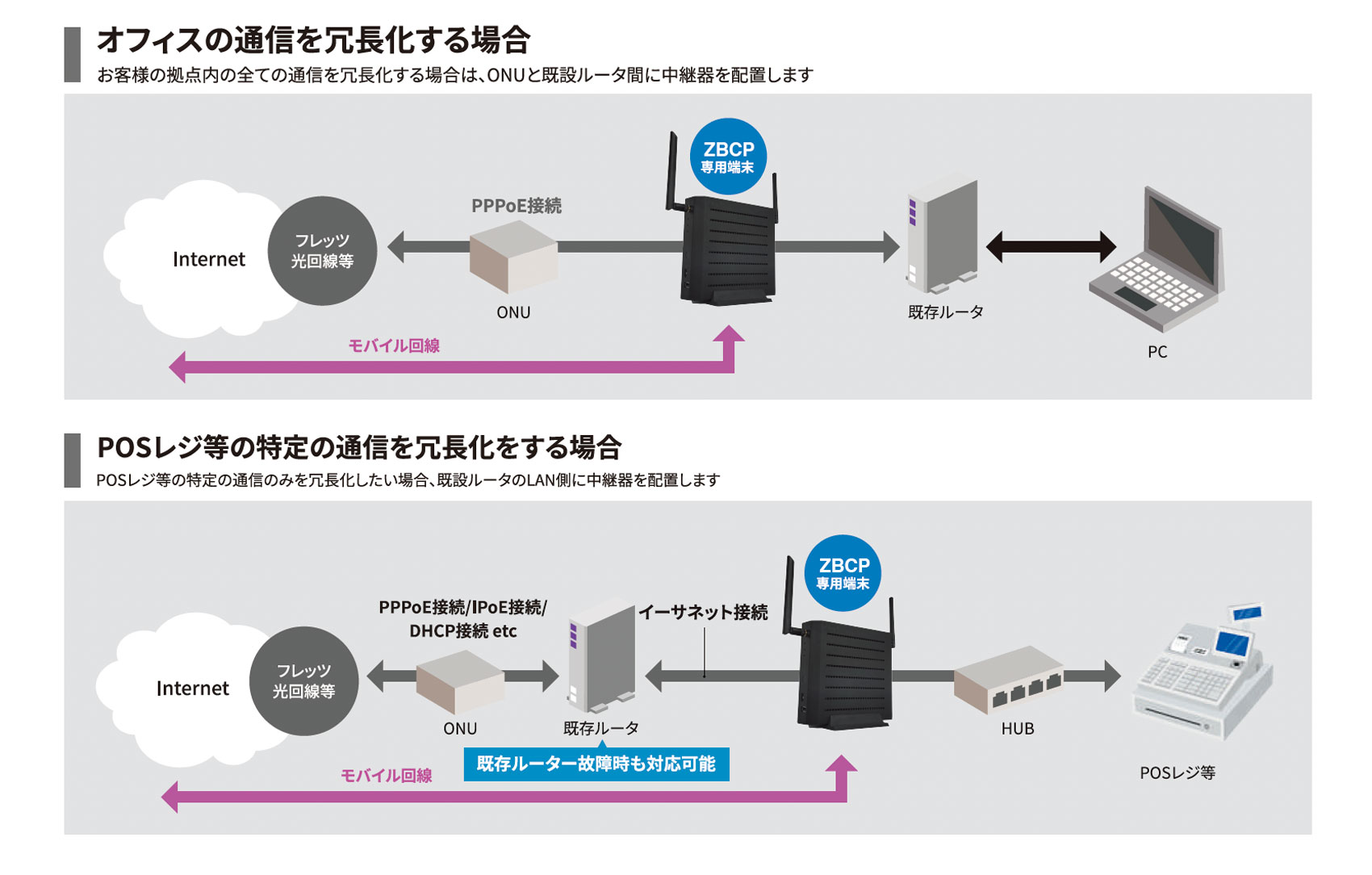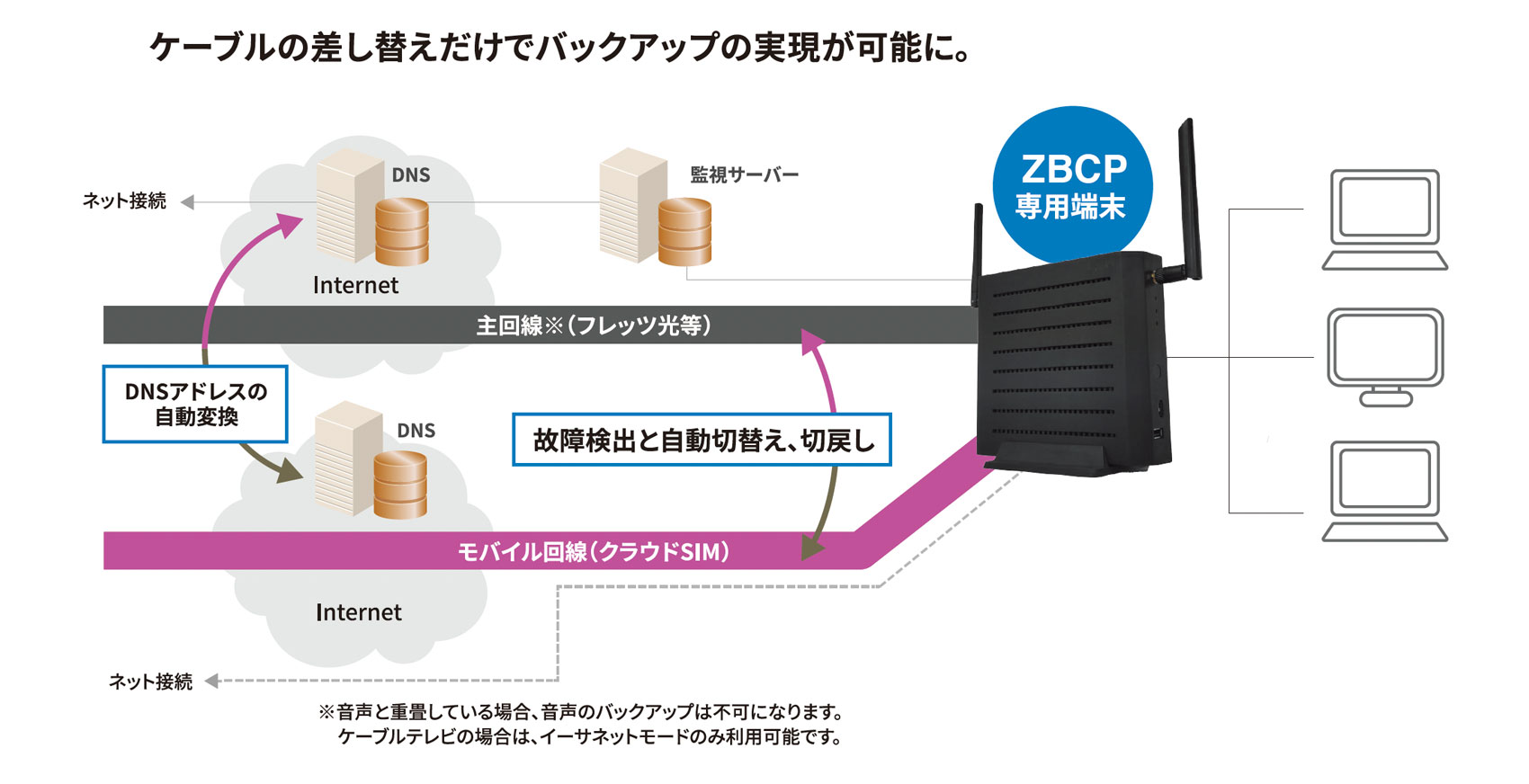 今やクラウドサービスを活用していない会社がないほど、経理、勤怠、給与、人事、販売、在庫など会社の主業務がクラウド化され、会社の業務継続は、ネットワークなくして運用できない状況となっています。その主回線である光回線の故障や、災害による通信障害が発生してもモバイルへ通信を転送して、業務の継続を可能にしたサービスがZBCPシリーズです。 また、モバイル通信はクラウドSIM 技術を利用することで、マルチキャリアに対応しています。複数のモバイルキャリアのSIM の中から自動的に最適なキャリアを検出し接続、通信状態に応じて接続先を切替えるため、モバイル通信も冗長化されております。