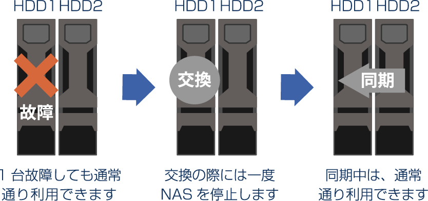 故障したディスクは新品に交換後、正常なディスクから交換されたディスクへデータを同期して再度ミラーリング構成に戻します。