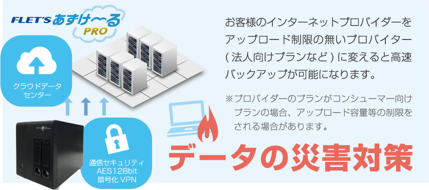 遠隔地でバックアップを取得することで、予期せぬ事故や災難が起因となってZD本体や、搭載されているハードディスクが使用できない状況になっても、「NTTフレッツあずけ〜るpro」を使ってクラウドバックアップより、お客様のデータを復元できます(※オプションとなります)。