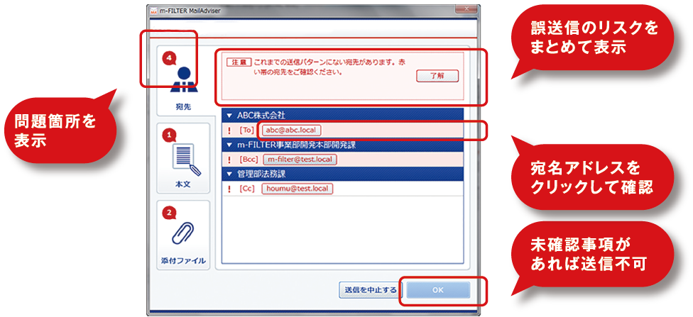 メール送信時に「助言」と「確認」をさせる機能