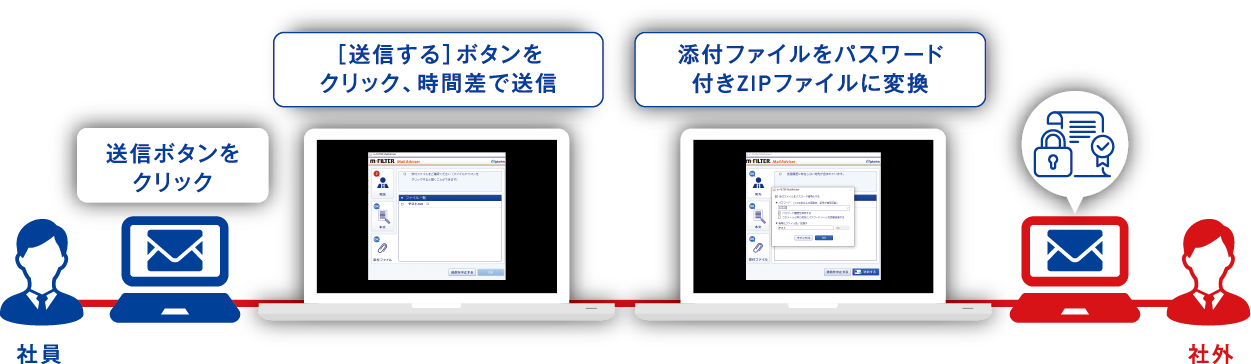 社外への送信を一定時間保留で送信(時差送信)できるため、万一も安心です。